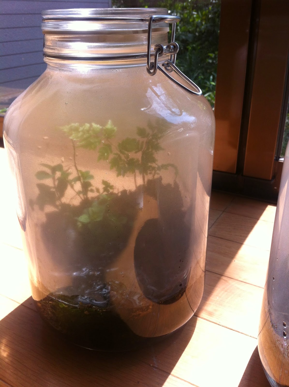 新宿からアマノエビ的なエビのカップルと、タニシのカップル、それに水草を持ち帰った私たちは、エビとタニシが日本原産であることを発見し、いい買い物をしたと悦に入った。家に帰るとすぐに庭から手頃な石を拾ってきてガラスの瓶に入れ、ペットショップのビニール袋に入っていた水と小さな動物たちを入れた。